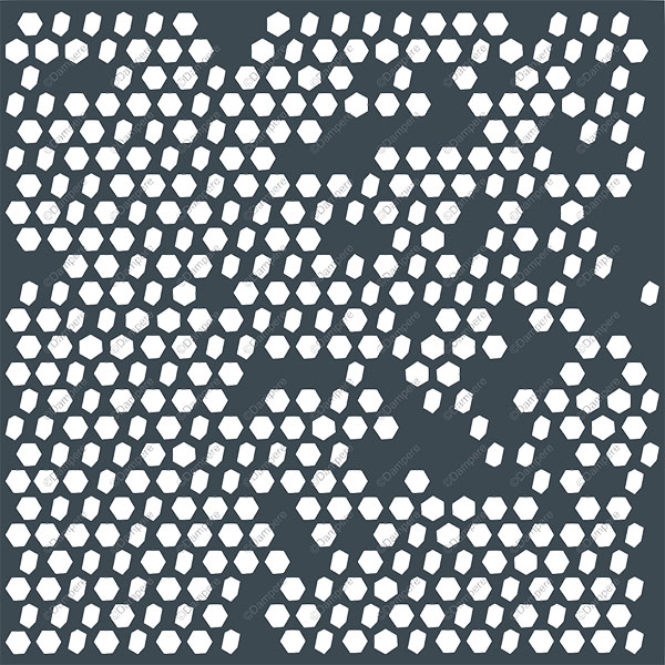 La tôle perforée décorative DAMPERE aux allures d'un nid d'abeilles, représente un dessin sur un panneau métallique percé de grands hexagones irréguliers et de formes géométriques pentagonales hors symétrie qui permettent une association diffuse pour former ce grand maillage discontinu, affichant une structure légèrement cagneuse. Le motif permet d'obtenir une belle transparence visible de loin grâce aux grandes parties opaques.Usages