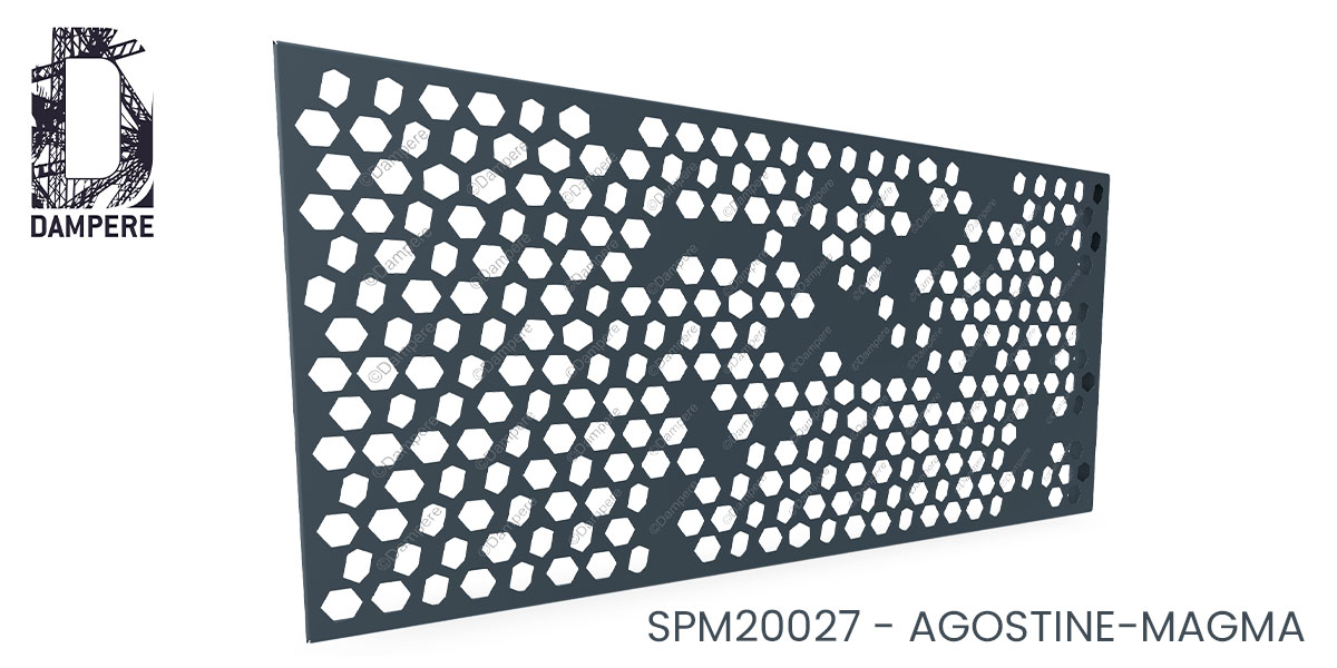 La tôle perforée Agostine Magma DAMPERE est une structure alvéolaire aux incidences minérales. Le réseau en nid d'abeilles apporte une grande transparence tout en améliorant la résistance mécanique du maillage métallique. L'effet de tissage interrompu confère une dimension esthétique supplémentaire au motif, visible de loin. Agostine Magma est une texture utilisée principalement en remplissage de garde-corps et brise soleil.Le conseil de l'équipe