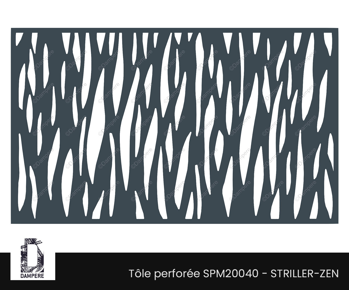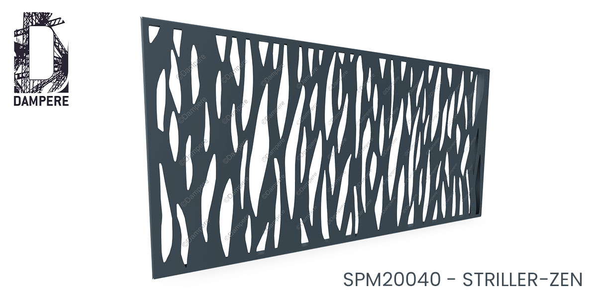 L'usage du motif STRILLER ZEN en panneau de clôture occultant convient sur un panneau en Acier Galvanisé d'épaisseur 2 mm avec pliage sur une hauteur de 180 cm. Cette disposition de la hauteur du poteau et l'entraxe entre panneau de 80 cm donneront une bonne résistance de la clôture occultant, que vous adapterez au scellement béton au sol selon la contrainte de la zone de vent et la sollicitation urbaine de la clôture. Le faible degré de transparence a pour effet d'augmenter la prise au vent, donc ajouter des jambes de force ou scellement plus important dans les zones fortement exposées aux rafales des vents. En cas de besoin, prévoir une peinture anti-graffiti pour faciliter le nettoyage en cas de vandalisme.Détails techniques