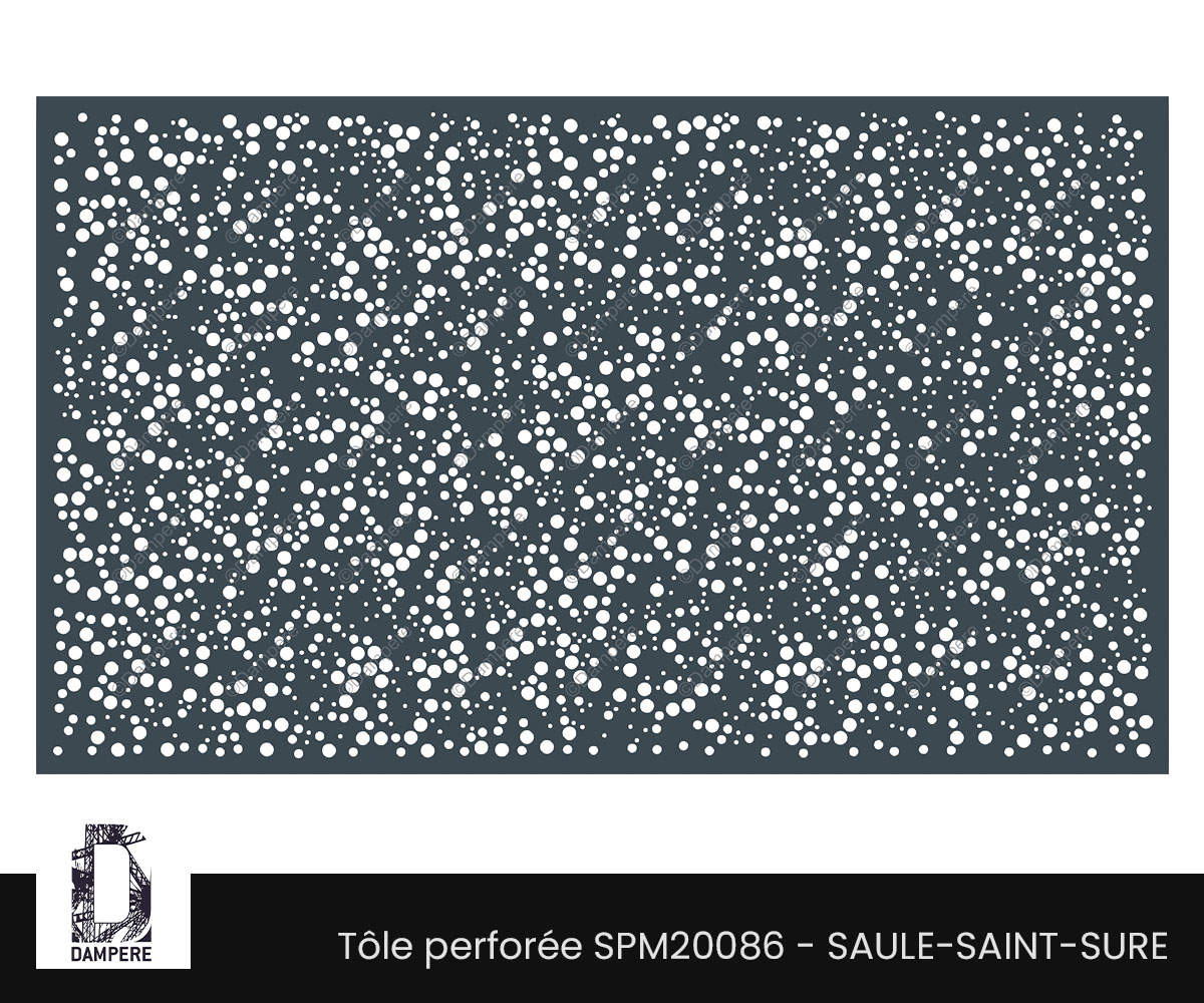 La tôle perforée Saule Saint Sure DAMPERE offre un motif poétique et aérien, où de délicats ronds de diamètres variés s'entrelacent pour créer une perforation qui évoque le mouvement tourbillonnant du vent. Chaque perforation semble représenter des flocons de pollen mêlés à des débris végétaux, emportés dans une danse fluide et organique. Le motif, en perpétuel mouvement, capte l'essence d'une brise légère traversant les feuillages d’un saule, avec ses éléments naturels flottant et se dispersant harmonieusement. Cette composition perforée, tout en légèreté, crée une sensation de vibration et de fluidité, renforçant l’impression d’une nature en perpétuel mouvement. Les différents diamètres des ronds apportent de la profondeur et de la richesse visuelle au design, tandis que leur disposition irrégulière donne un effet presque aléatoire qui imite parfaitement le chaos maîtrisé de la nature. Idéale pour des applications en façade, garde-corps, ou clôture décorative, la tôle Saule Saint Sure permet non seulement de protéger tout en laissant passer la lumière, mais elle offre également un jeu d'ombres fascinant sur les surfaces environnantes.Usages