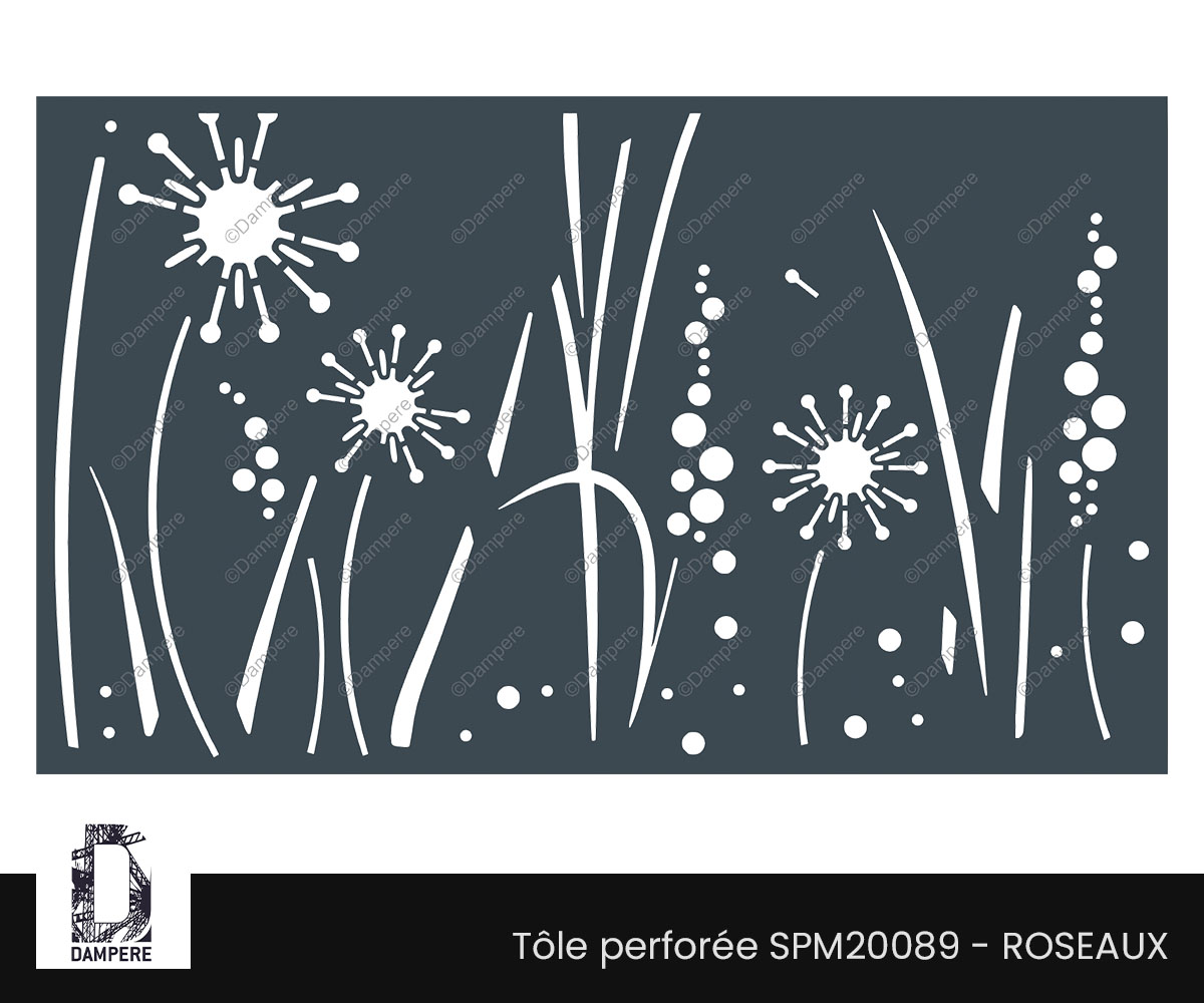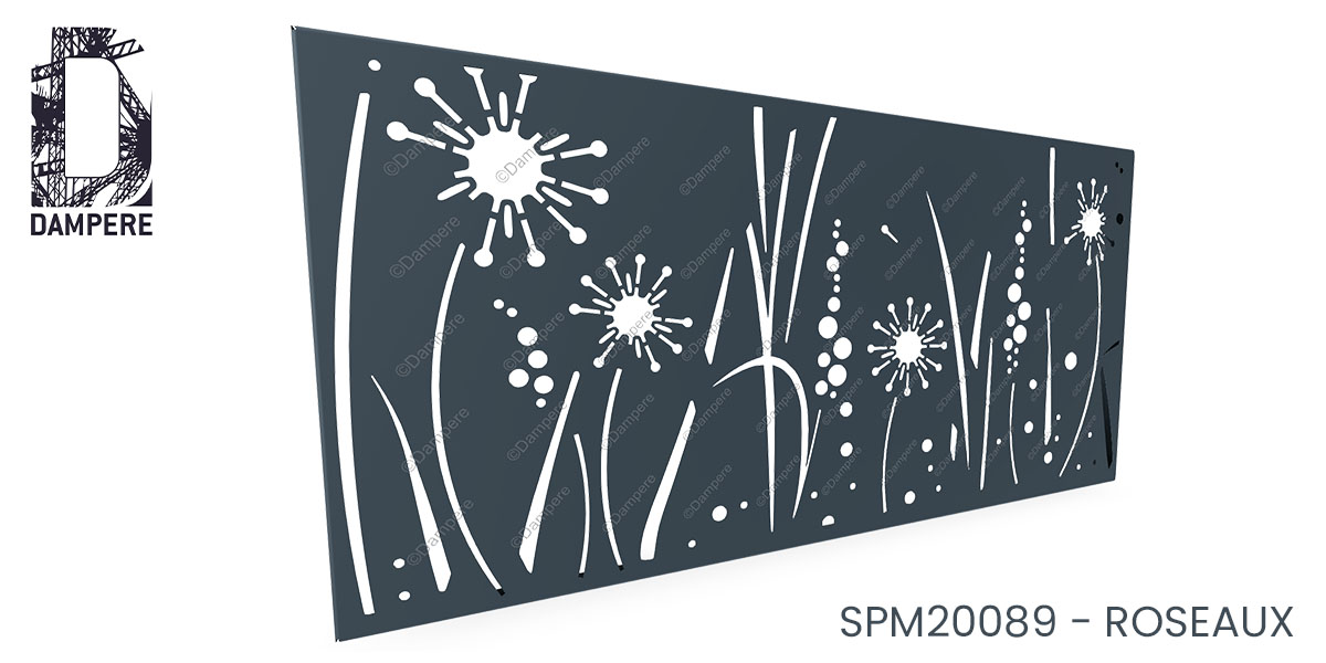 Le panneau occultant ROSEAUX DAMPERE se distingue par un motif végétal élégant, où des tiges de roseau se mêlent à des fleurs de pissenlit dans une composition à la fois abstraite et vivante. Ce motif en découpe laser crée un jeu subtil entre légèreté et dynamisme, où chaque tige semble onduler sous l’effet d’une brise invisible, tandis que les fleurs de pissenlit apportent une touche de poésie. L’abstraction du design renforce l’effet de mouvement et de fluidité des plantes, permettant à ce panneau de capturer l’essence naturelle tout en apportant une dimension artistique. Ce panneau métallique occultant est idéal pour des projets d'aménagement urbain ou résidentiel, apportant non seulement une protection visuelle efficace, mais aussi un élément décoratif qui transforme les espaces extérieurs en lieux apaisants et raffinés par les formes végétales. L’alternance entre les pleins et les vides en découpe laser sur mesure permet une circulation douce de la lumière, projetant des ombres en mouvement qui varient au fil de la journée, enrichissant l’atmosphère avec une sensation de nature en perpétuelle évolution.Usages