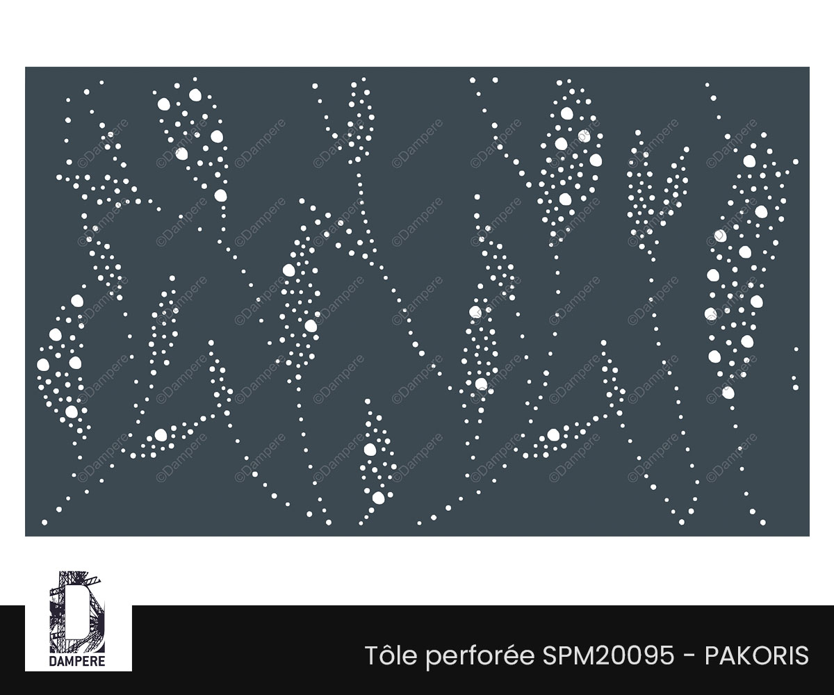 Le panneau perforé PAKORIS DAMPERE se distingue par un motif végétal dynamique, où de larges feuilles pointues, finement accrochées à leurs tiges, sont illustrées par une série de trous ronds de différents diamètres. Ce jeu de perforations, allant des plus petites aux plus grandes, crée un effet de pixelisation qui enrichit visuellement la structure. Les perforations plus larges viennent accentuer les détails et les contrastes, apportant une profondeur supplémentaire au motif. Cette conception subtile permet de capturer l'essence de la nature tout en lui conférant un aspect contemporain. Ce panneau décoratif joue parfaitement avec la lumière naturelle, projetant des ombres complexes et en mouvement qui évoquent un environnement végétal en perpétuelle évolution. Le contraste entre les différentes tailles de perforations donne au motif un caractère vivant et organique, idéal pour des applications en façades, garde-corps, ou clôtures urbaines. Le motif des feuilles, rendu de manière abstraite mais identifiable, s'intègre harmonieusement dans des projets architecturaux modernes, où l'on cherche à apporter une touche de nature stylisée tout en conservant une esthétique élégante et fonctionnelle. Le panneau PAKORIS permet ainsi de marier la transparence et l'occultation, tout en créant un décor végétal qui enrichit les espaces extérieurs et intérieurs, assurant une connexion visuelle avec l’environnement tout en offrant un design graphique puissant.Usages
